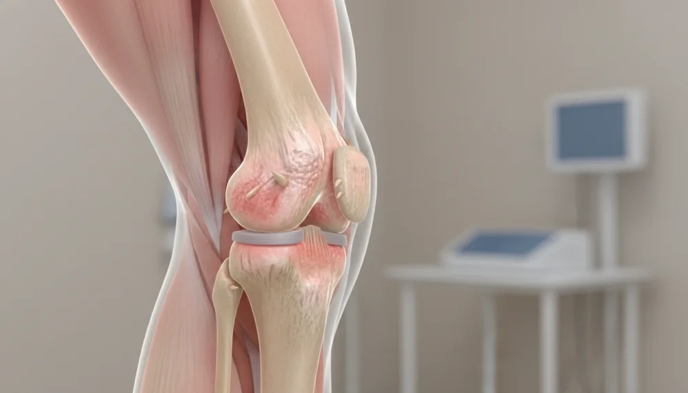 In osteoartrita, cartilajul din articulatia genunchiului se distruge treptat. Pe masura ce cartilajul se uzeaza, spatiul protector dintre oase se micsoreaza. Acest lucru poate duce la fenomenul de frecare a oaselor intre ele, fapt ce determina un tablou clinic dureros, dar si la formarea de pinteni ososi durerosi.