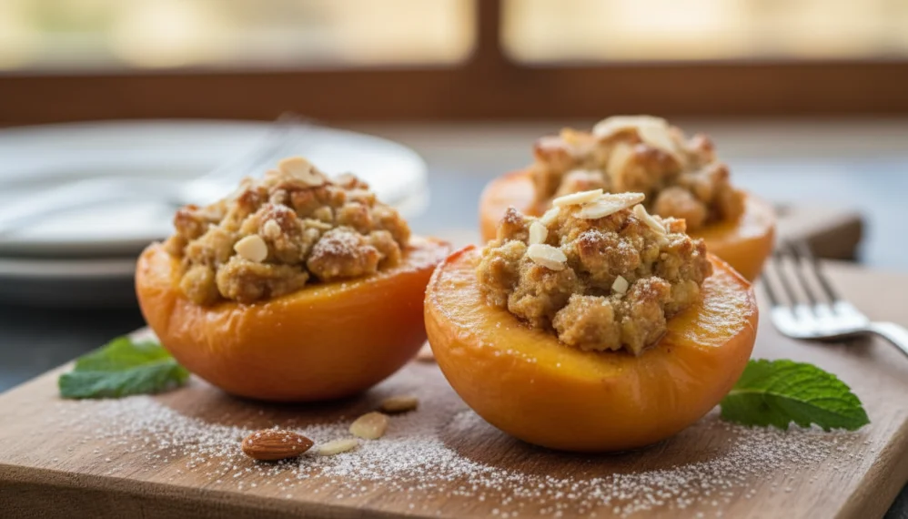Transforma piersicile proaspete intr-un desert cald fabulos, cu ajutorul unei umpluturi compuse din caise uscate, migdale prajite si frimituri macinate de la prajitura amaretti.