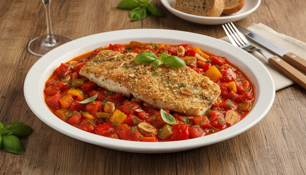 Crapul gatit la cuptor cu sos de rosii si ardei este un preparat recomandat in dieta pacientilor bolnavi de ciroza hepatica: