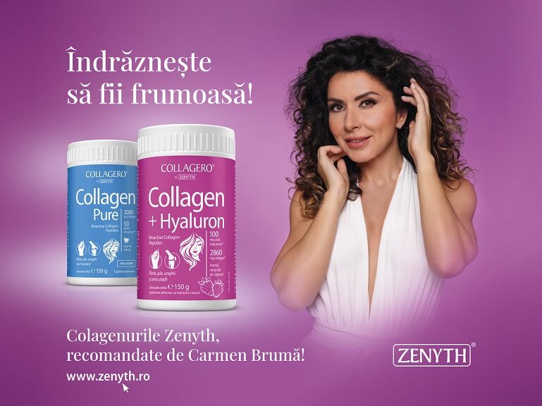 „Recomand cu incredere Colagenurile Zenyth. Pe langa beneficiile pe beauty pe care le-am remarcat la administrarea pe termen lung a suplimentelor cu colagen, avem si beneficii pe sanatatea articulatiilor, pe prevenirea aparitiei rigiditatii articulare, pe prevenirea durerilor. Pot sa va spun, in urma acestei experiente de multi ani cu suplimentele de colagen, ca n-am avut nici macar o data o durere articulara. Pun chestia aceasta pe seama suplimentarii si sigur a unei mosteniri genetice bune“, povesteste Carmen Bruma.