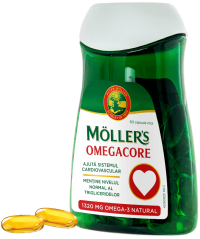 Un produs care asigura necesarul zilnic de acizi grasi Omega-3 este Omegacore. Cu doar 2 capsule pe zi se asigura 1320 mg de acizi grasi Omega-3 naturali si se pot administra pana la 6 capsule zilnic, in conformitate cu recomandarile medicului curant, cumuland, astfel, pana la 4 g EPA+ DHA/zi.