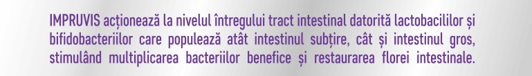 Impruvis este o gama de probiotice care se remarca prin formule ce contin varietate de tulpini de bacterii benefice, atat din familia lactobacililor- Lactobacillus rhamnosus GG, Lactobacillus acidofilus, Lactococcus Lactis, cat si din cea a bifidobacteriilor- Bifidobacterium (animalis) lactis, Bifidobacterium longum, cunoscute datorita studiilor clinice pentru beneficiile asupra sanatatii intestinale si a sistemului imunitar.